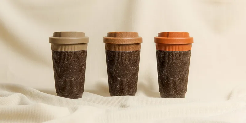 Kaffeeform uses recycled coffee grounds, recycled wood fibers, and plant-based polymers to create sustainable and durable materials, such as cups and glasses. The grounds are collected from Berlin cafes, dried, and processed in a social workshop. They are then combined with discarded wood fibers from the logging industry to form a sturdy yet lightweight material, which can be colored with non-toxic pigments. The entire production process is carried out locally in Germany, promoting sustainability and the circular economy.